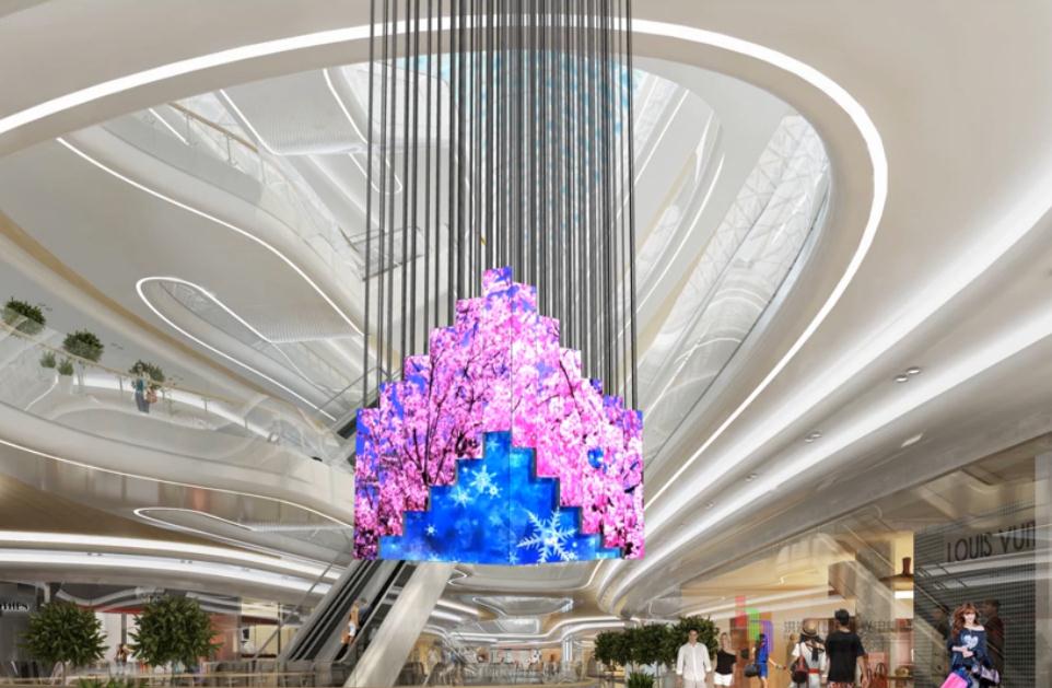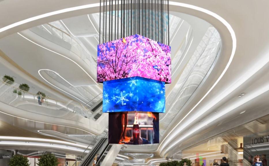 套娃吊裝屏的基本構造由驅動電機、工業編程和智能LED顯示屏以及吊裝機械組成,這種顯示屏能夠分成多層,目前以三層套娃為主,在吊裝電機以及旋轉電機的驅動下LED顯示屏進行伸縮展開形成巨大的棱形顯示屏。